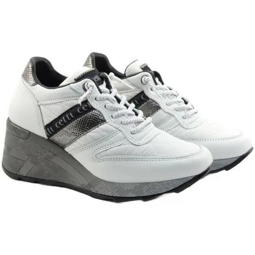 Description : Chaussure de sport pour femme CETTI 1145 en cuir et nylon matelassé blanc. Détails métalliques et noirs. Lacets élastiques. Semelle intérieure rembourrée amovible. Cale lumineuse bicolore antidérapante.