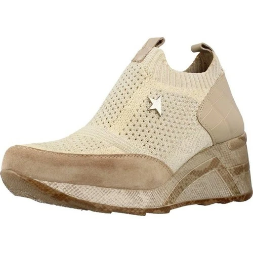 Description : Chaussure de sport pour femme CETTI 1190 en tissu élastique perforé et renforts en daim beige. Détails métalliques. Semelle intérieure rembourrée amovible. Cale légère bicolore avec patin denté antidérapant