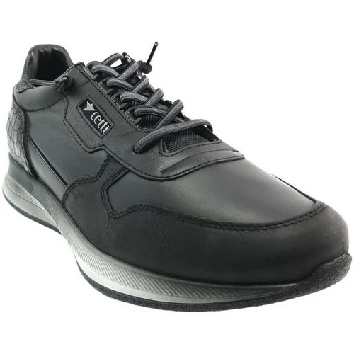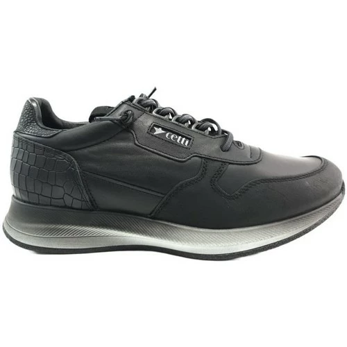 Description : Chaussure de sport pour homme CETTI 1242 en cuir noir et détails en cuir texturé. Lacets élastiques. Semelle intérieure rembourrée amovible. Plancher bicolore confortable avec patin antidérapant.