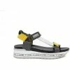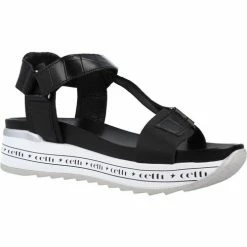 Description : Chaussure de sport pour femme CETTI 1190 en cuir noir associée à des lanières à imprimé animal. Sangle de cheville avec ajustement velcro. Semelle intérieure matelassée noire. Cale légère bicolore avec patin denté antidérapant.